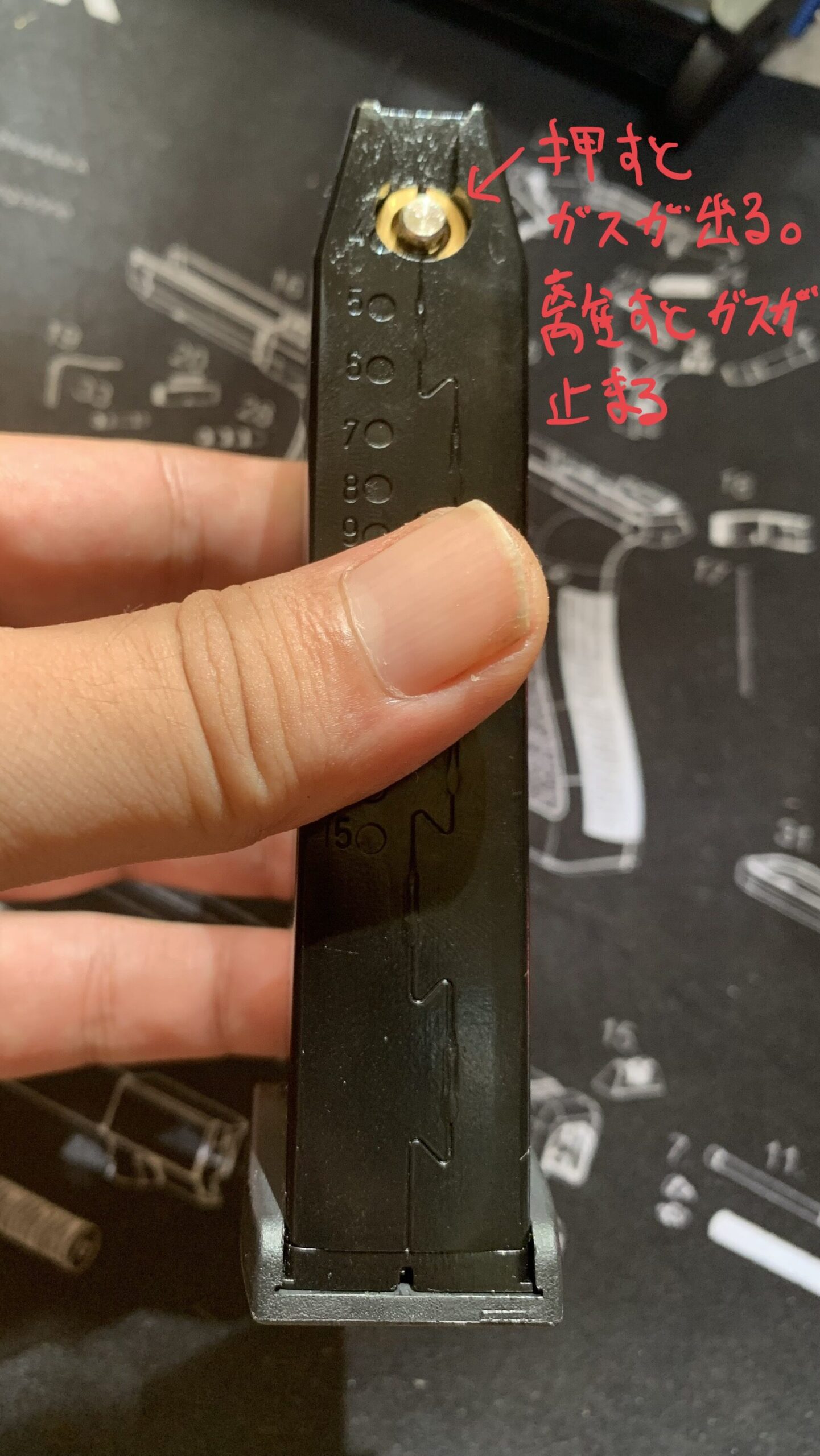 次にマガジンにガスをほんの少しだけ入れてバルブを指で押してみてください。空のマガジンに比較してバルブの荷重が大きくなっていることがわかるはずです。