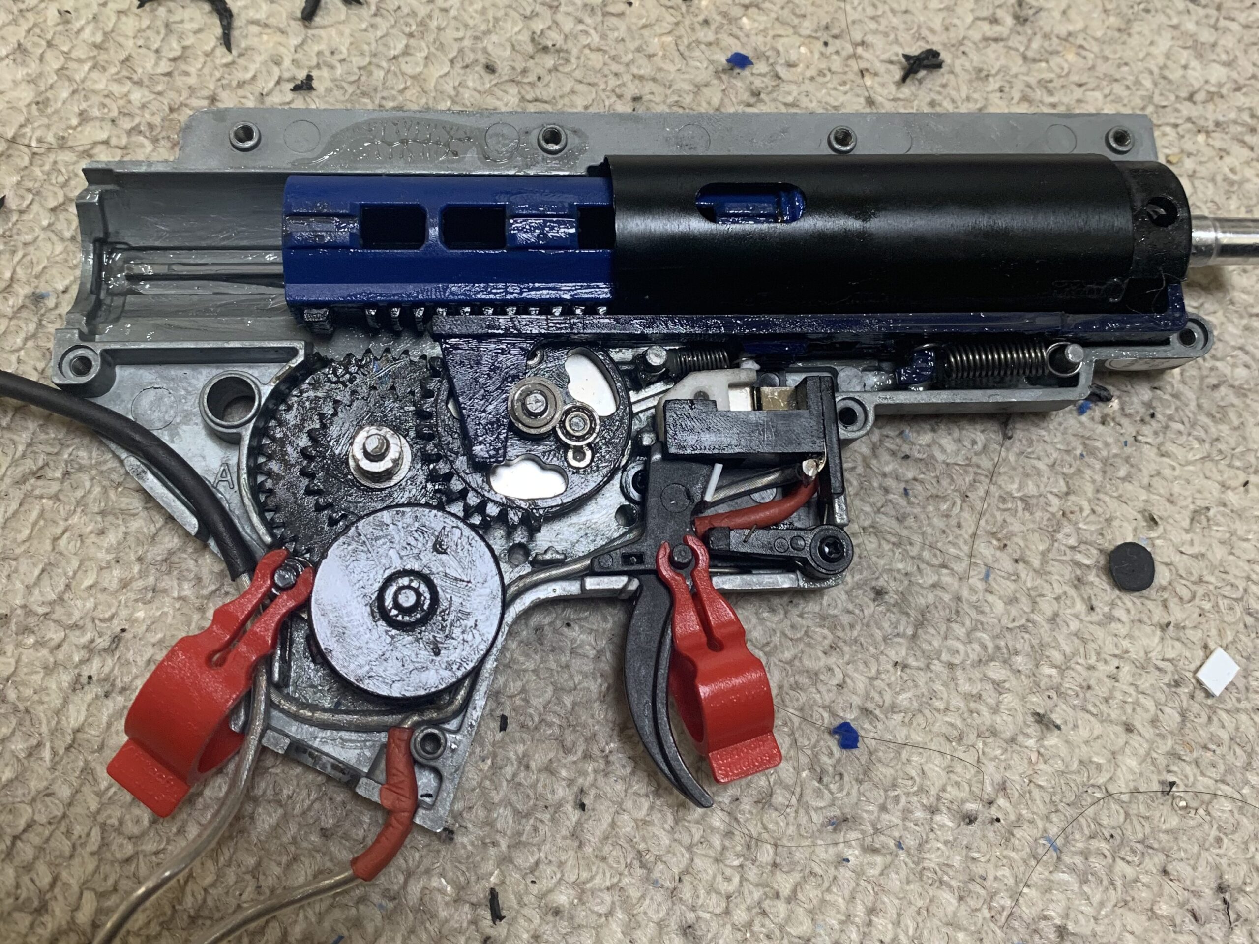 スプリングには音鳴り防止のため高年度のシリコングリス(東京マルイさん高粘土グリス)を塗ってスプリングガイドにはベルハンマーNo.2を塗ります。
