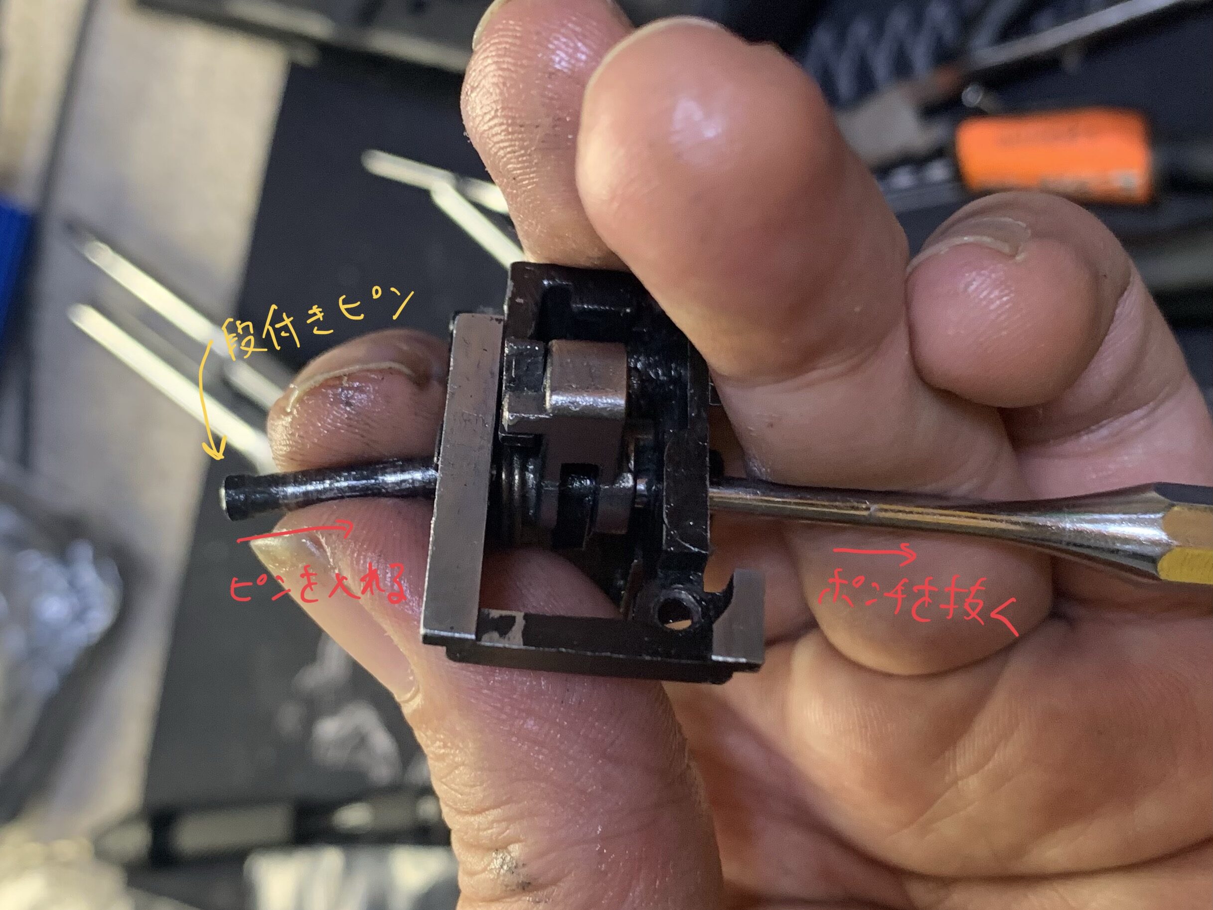 このピンポンチでハンマーを仮組みした状態で段付きピンを挿入口に当て込みます(方向が重要です)。