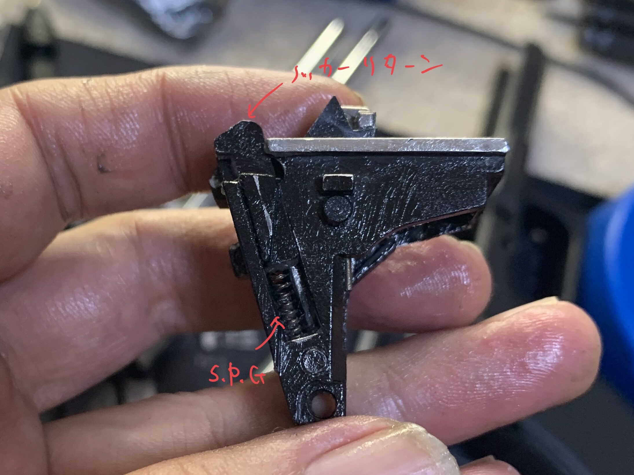 次にトリガー周辺にスライドストップ、スライドストップスプリングを組みます。