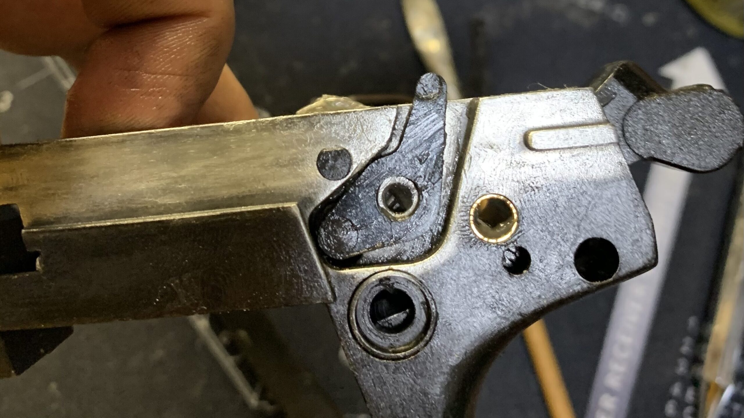トリガーバーを組み込む為にシャーシのシアーを指で押してトリガーバーを入れるスキマを作ります。
