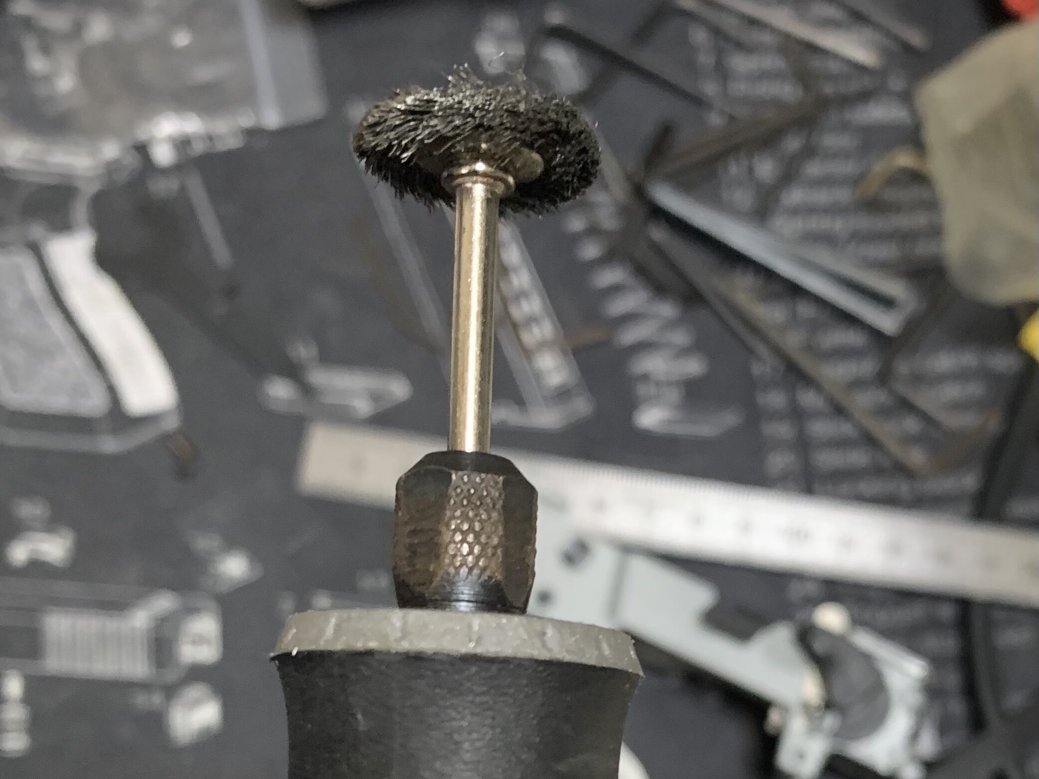 ピンバイスだけと穴にバリが発生するので、仕上げにリューターで穴の淵を少しだけ削ります。