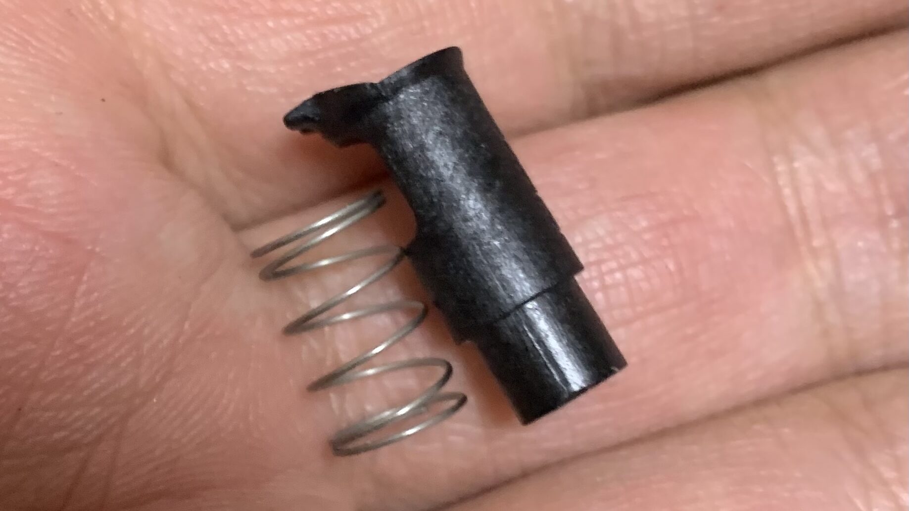 初速を下げる手段としては、バレルのカット、ノズルへの穴開け、ノズルの穴絞りなどいろいろありますが、ここで私が取った初速を下げる手段はフローバルブスプリングのカットです(簡単かつ元に戻せないので法令的に良いと思います)。