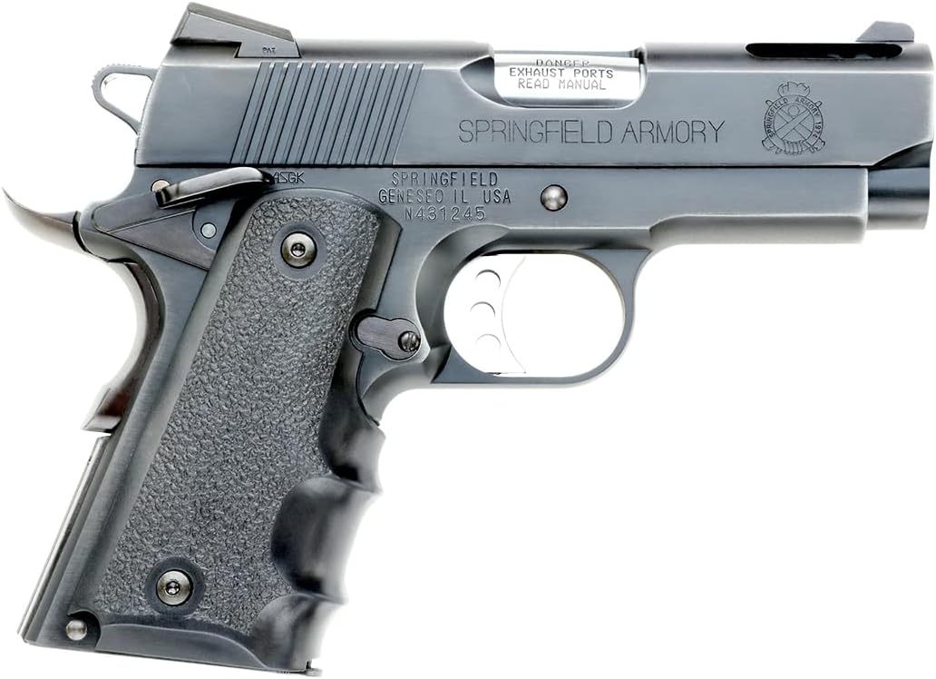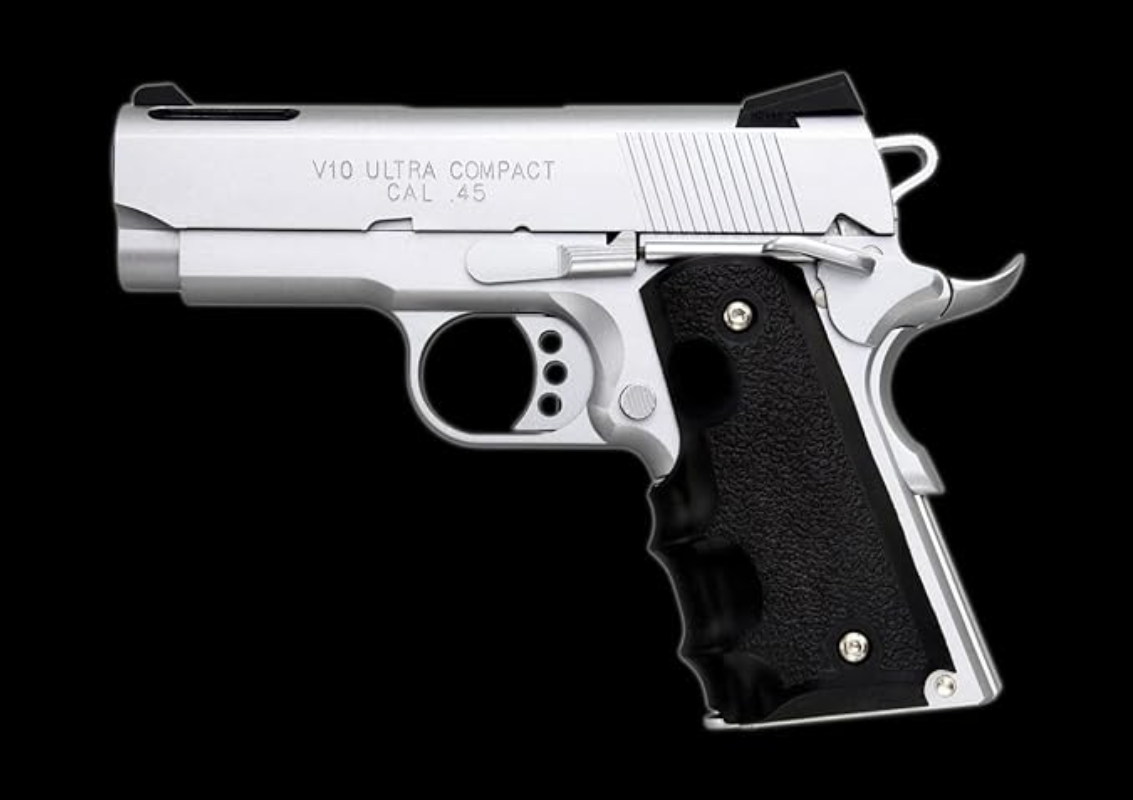 実物のスプリングフィールド アーモリー V10 ウルトラコンパクトは1996年頃に登場した.45ACP拳銃です。最大の特徴はスライド上面とバレルに開けられた10個のガスポート、名称はV-10 ポートで、発射ガスを上方へ噴出させてマズルジャンプを物理的に抑制するメカニズムです。