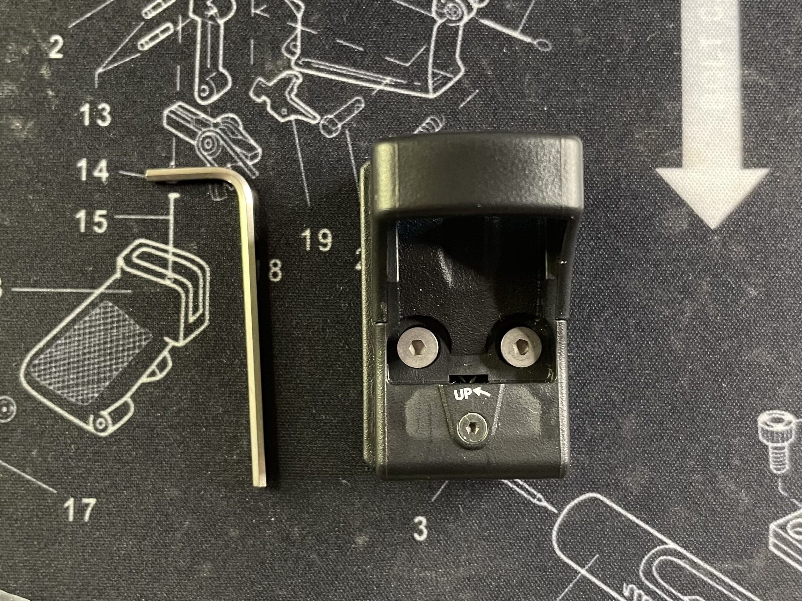 次にそのまま下面を見てもレール部が見えるだけなのでレールマウントを外して見て行きます。レールマウントは付属の六角レンチを使って下の写真のネジ2本を外します。