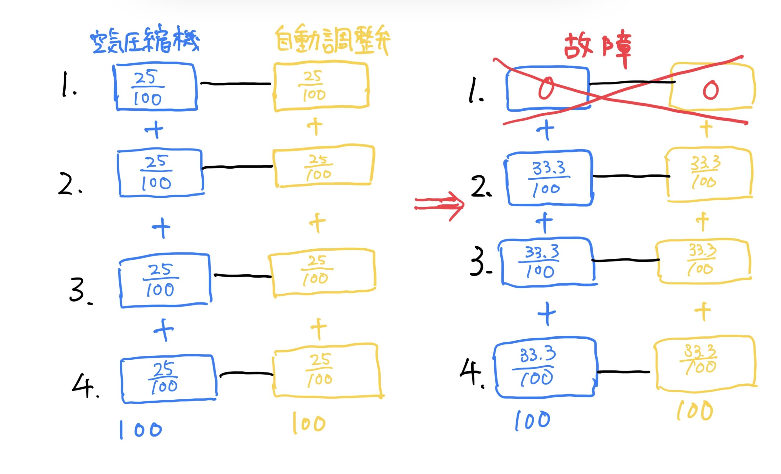 もしどれか1系統が壊れた場合は、残りの3系統を33.3の能力で運転すれば33.3×3系統で必要な能力100が発揮できる。